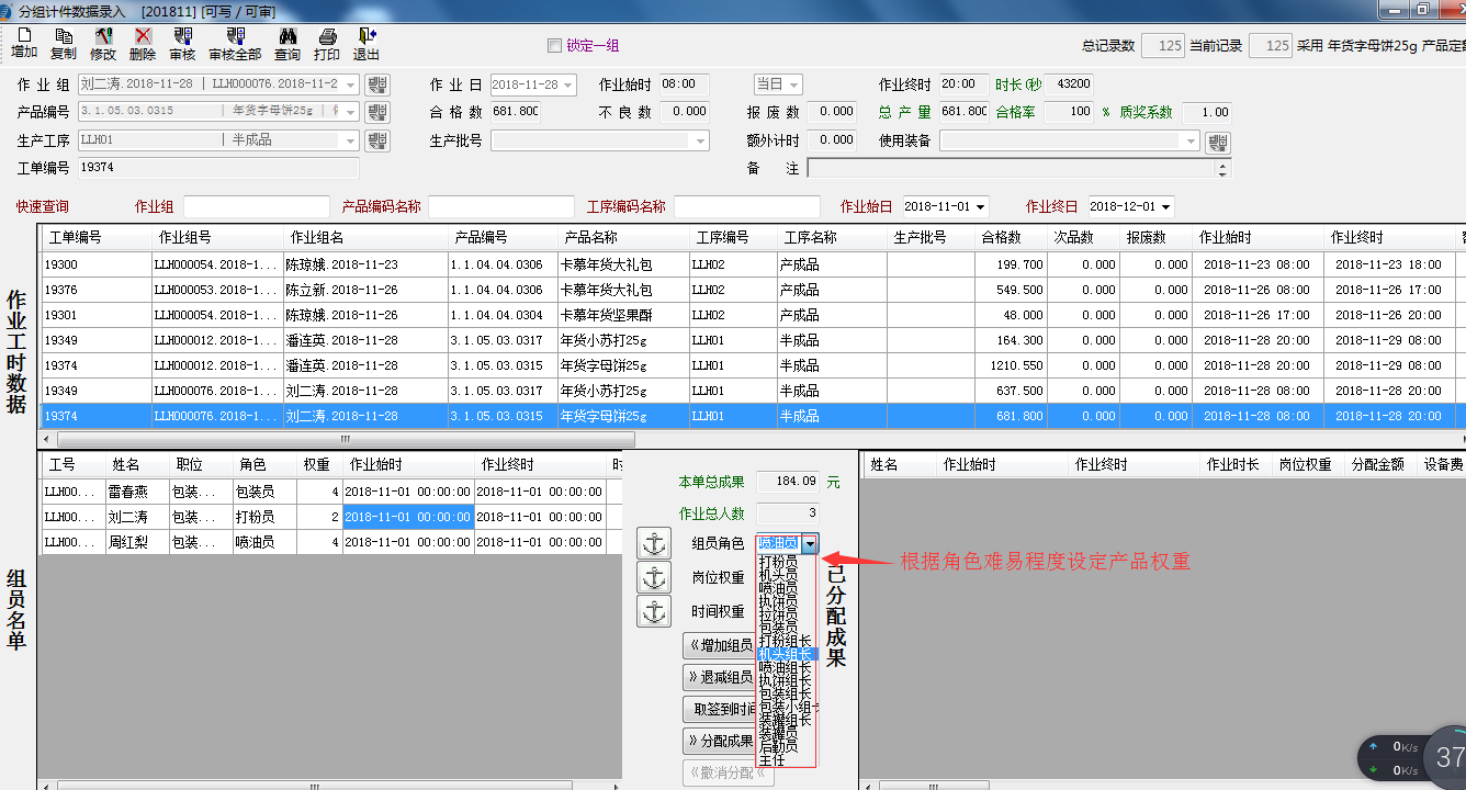 對(duì)于計(jì)件工資產(chǎn)品工序多且工序難易程度不一等綜合因素考慮,為了保證能夠正常快速統(tǒng)計(jì)分析員工個(gè)人參入計(jì)件所得,特別啟用角色加權(quán)重的模式,確保每個(gè)產(chǎn)品可以根據(jù)生產(chǎn)難易程度合理設(shè)置不同角色權(quán)重,如下圖: