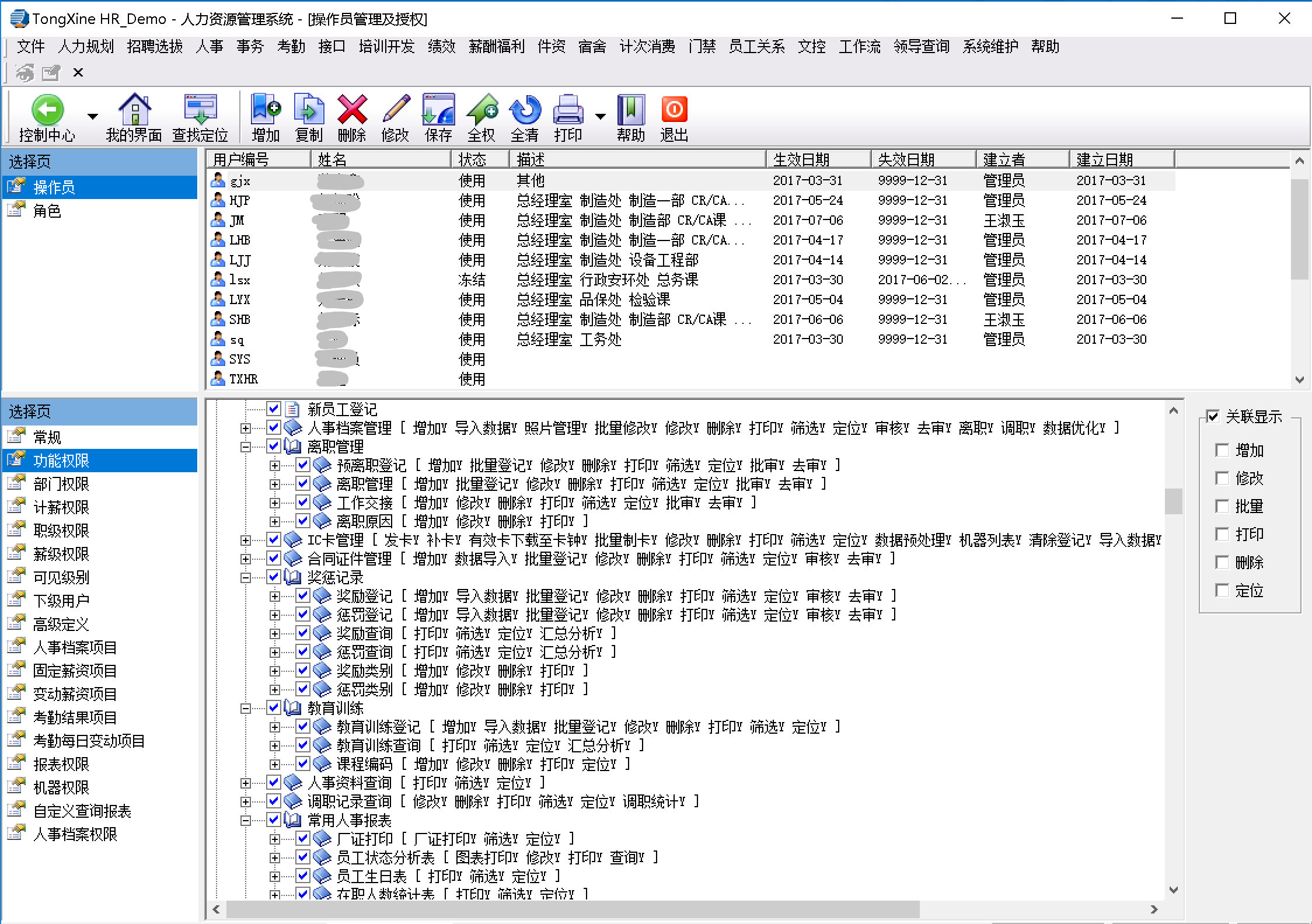 針對此種情況,同鑫HR系統(tǒng)結(jié)合眾多用戶的經(jīng)驗,設(shè)置了各種不能的權(quán)限管理模式,在分布式權(quán)限控制系統(tǒng)中職位與權(quán)限相結(jié)合,不因人的流動而造成職責的空缺。并且,既可以統(tǒng)一管理,又明確分工。合理的下放職權(quán),亦可減輕各崗位的工作負擔。