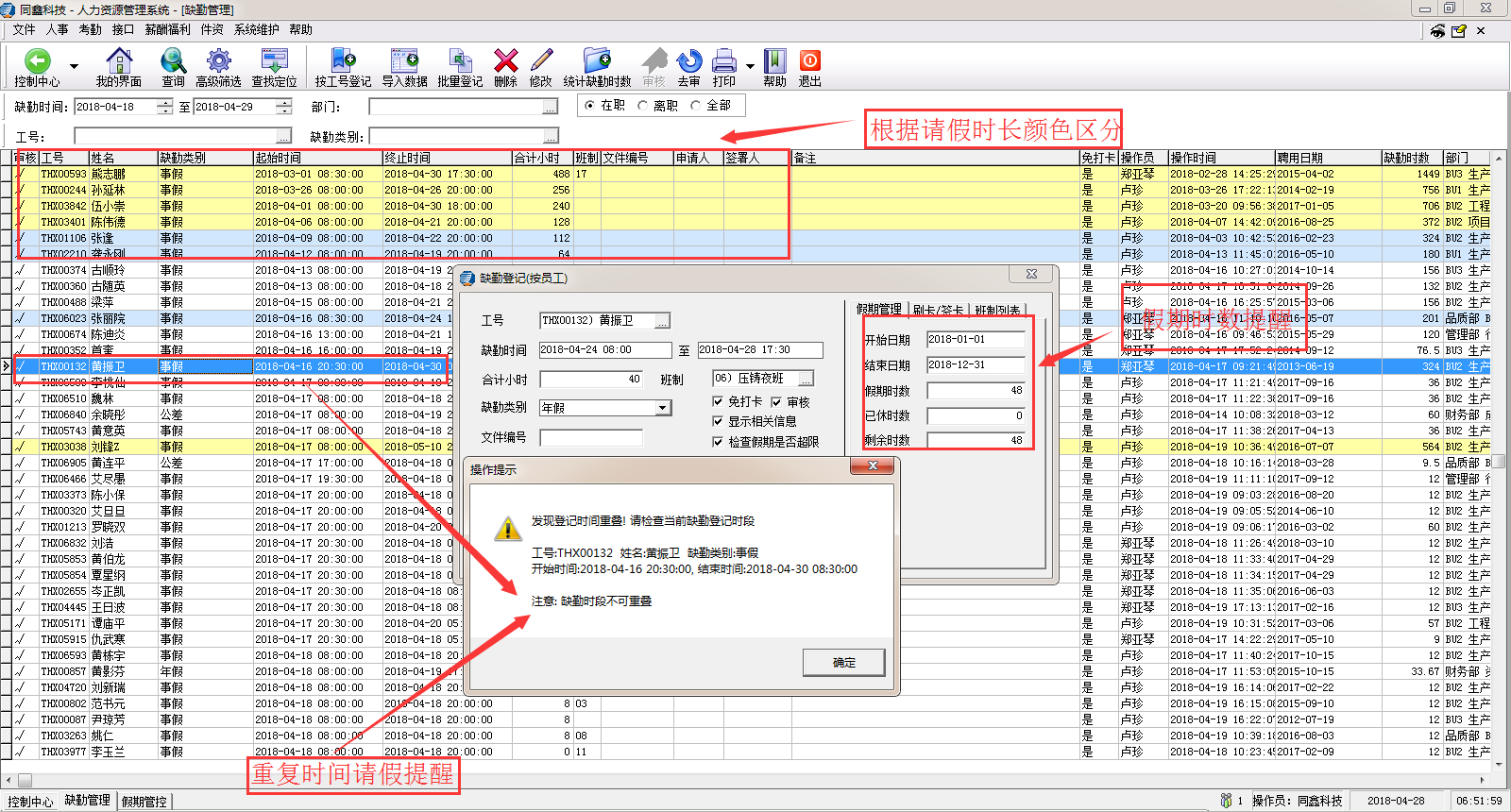 2、在請假控制方面,可以根據員工的請假時長設定不同的顏色進行區分,同時針對于不同的請假類別以及重復的請假輸入進行控制,做到防呆提醒功能,以減少HR管理者請假事務性工作的出錯率。