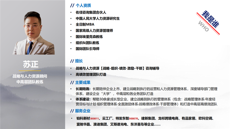與此同時,在同鑫公司另外一個會議室,也在舉辦一場由蘇正老師主導的戰略增長績效訓練營活動,蘇正老師擅長增長戰略到執行管理的咨詢輔導、中高層團隊教練。本訓練營通過為期六天的訓練,通過(課堂分享和研討)教-練(課后小組實戰研作業)-導(督導和輔導)-考(作業評估和反饋)模式為成員提供全面的戰略增長績效訓練,幫助企業解決績效管理難題,實現業績增長。