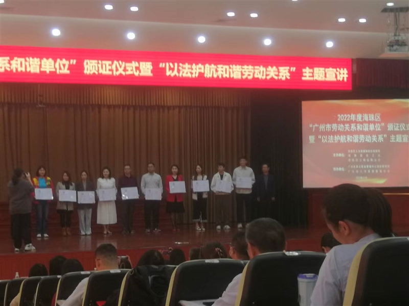 近日,廣州市人力資源和社會保障局、廣州市總工會、廣州市企業聯合會/企業家協會、廣州市工商業聯合會公布了2022年度廣州市勞動關系和諧企業名單,同鑫公司應邀參加了2022年度海珠區“廣州市勞動關系和諧單位“頒證儀式,并榮獲”廣州市勞動關系和諧企業”稱號。
