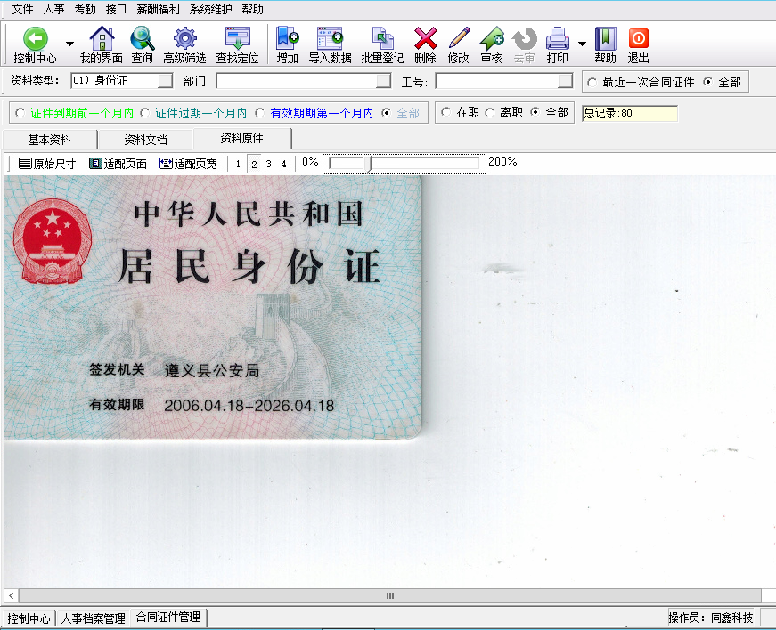 2019-06-05 10:36:55 瀏覽:2940 咨詢電話:400-1800-278隨著企業(yè)的不斷發(fā)展與壯大,企業(yè)對(duì)員工信息的管理越來(lái)越嚴(yán)格與復(fù)雜,越來(lái)越多的證件與合同需要記錄在系統(tǒng)中,實(shí)現(xiàn)信息化管理。如何即簡(jiǎn)單又高效地處理合同證件的管理?如何將合同或證件的掃描件上傳到系統(tǒng)中?如何隨時(shí)隨地的導(dǎo)出我想查看的證件信息,并設(shè)置到期提醒功能?別擔(dān)心,同鑫hr軟件——合同證件管理模塊將解決您的這些煩惱!