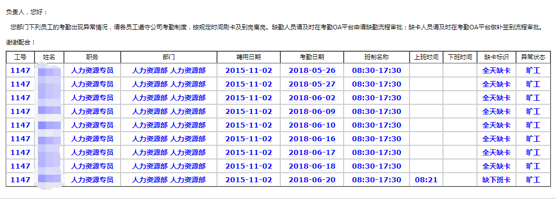 4、考勤異常下發(fā)通知、回饋不及時(shí),溝通難度大。