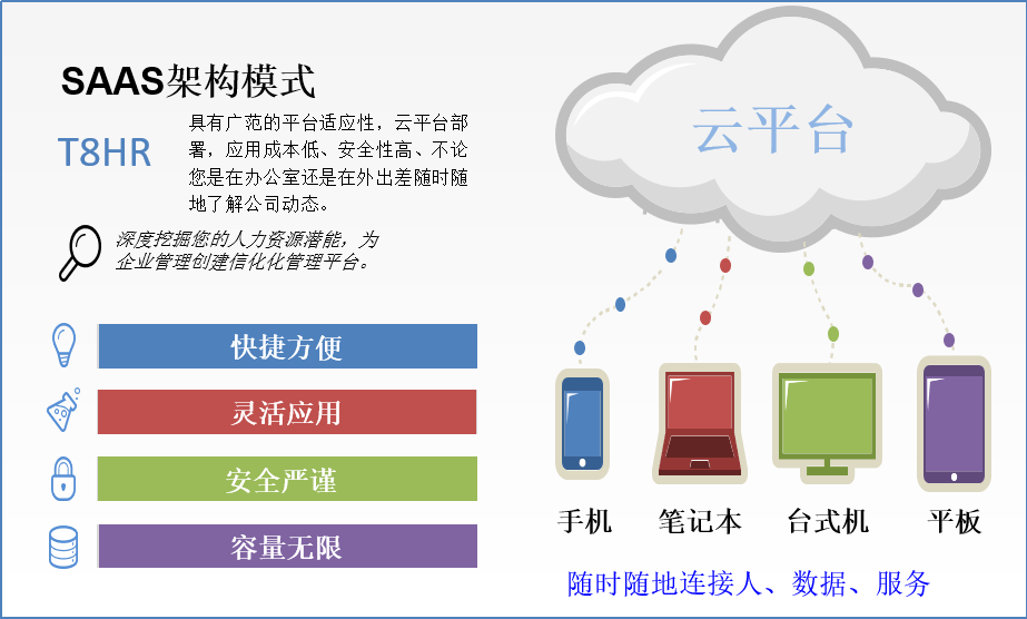 在此背景之下,同鑫科技運用大數據的成果,為多向公司搭建了eHR云平臺管理模式,無論是管理者還是員工,都可以通過筆記本電腦,手機,平板,臺式機等終端,實現線上線下隨時隨地連接人、數據和服務。